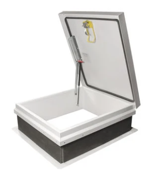 The Single Leaf Roof Hatch provides secure, insulated rooftop access with a 14-gauge galvanized steel cover and curb, finished in a durable white powder coat. The cover opens to 90° with gas spring assist and features 1" rigid styrofoam insulation for energy efficiency. A 12" high curb with integral counterflashing and pre-drilled flanges ensures easy installation and weather protection.